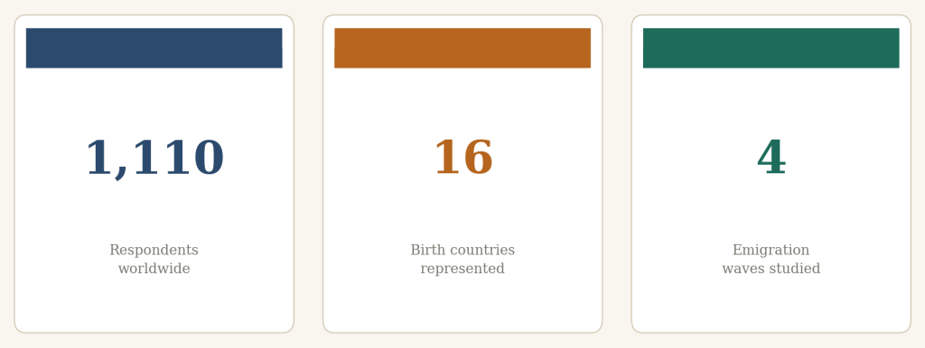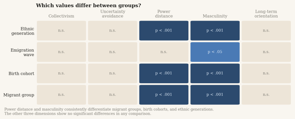 On three of the five dimensions, the groups were strikingly similar. Collectivism, uncertainty avoidance, and long-term orientation showed no significant differences across generations, emigration waves, or migrant groups. Values that one might expect to erode over decades of living abroad appear, instead, to hold.